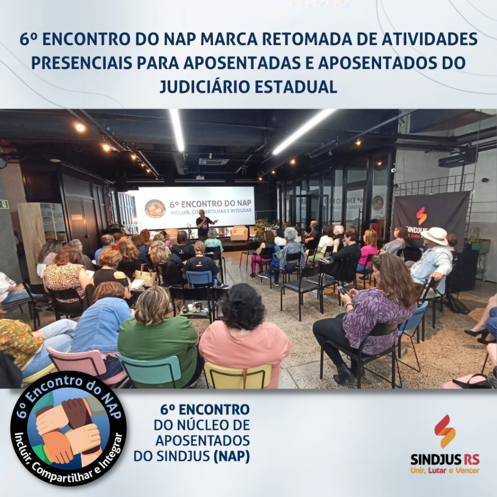 Após mais de dois anos de pandemia, que restringiram as atividades presenciais, as aposentadas e aposentados da Justiça gaúcha voltaram a se reunir nesta sexta-feira (22/10), no 6º Encontro do Núcleo de Aposentados (NAP) do Sindjus.