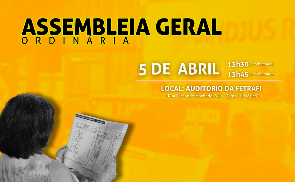 O Coordenador-Geral e a Diretoria Executiva do Sindicato dos Servidores da Justiça do Estado do Rio Grande do Sul (SindjusRS), em cumprimento às disposições estatutárias, CONVOCAM toda a categoria para ASSEMBLEIA GERAL ORDINÁRIA, que será realizada no dia 5 de abril de 2024, sexta-feira, a partir das 13h30, em primeira chamada, e 13h45 em segunda chamada, no Auditório da Fetrafi (Rua Cel. Fernando Machado, 820 – Centro Histórico), em Porto Alegre, com a seguinte pauta: