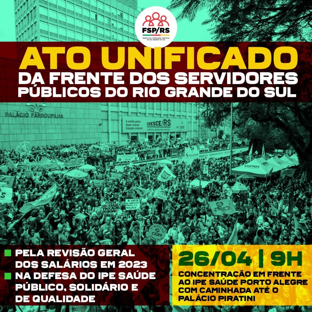 A Frente dos Servidores Públicos do RS (FSP), articulação e movimento que reúne sindicatos e associações do serviço público estadual, manifesta, através da presente, seu repúdio à reestruturação do IPE Saúde a ser implementada pelo governador Eduardo Leite e a urgência da revisão geral anual nos vencimentos dos servidores estaduais, dado o avanço do empobrecimento das categorias, temas absolutamente conectados.