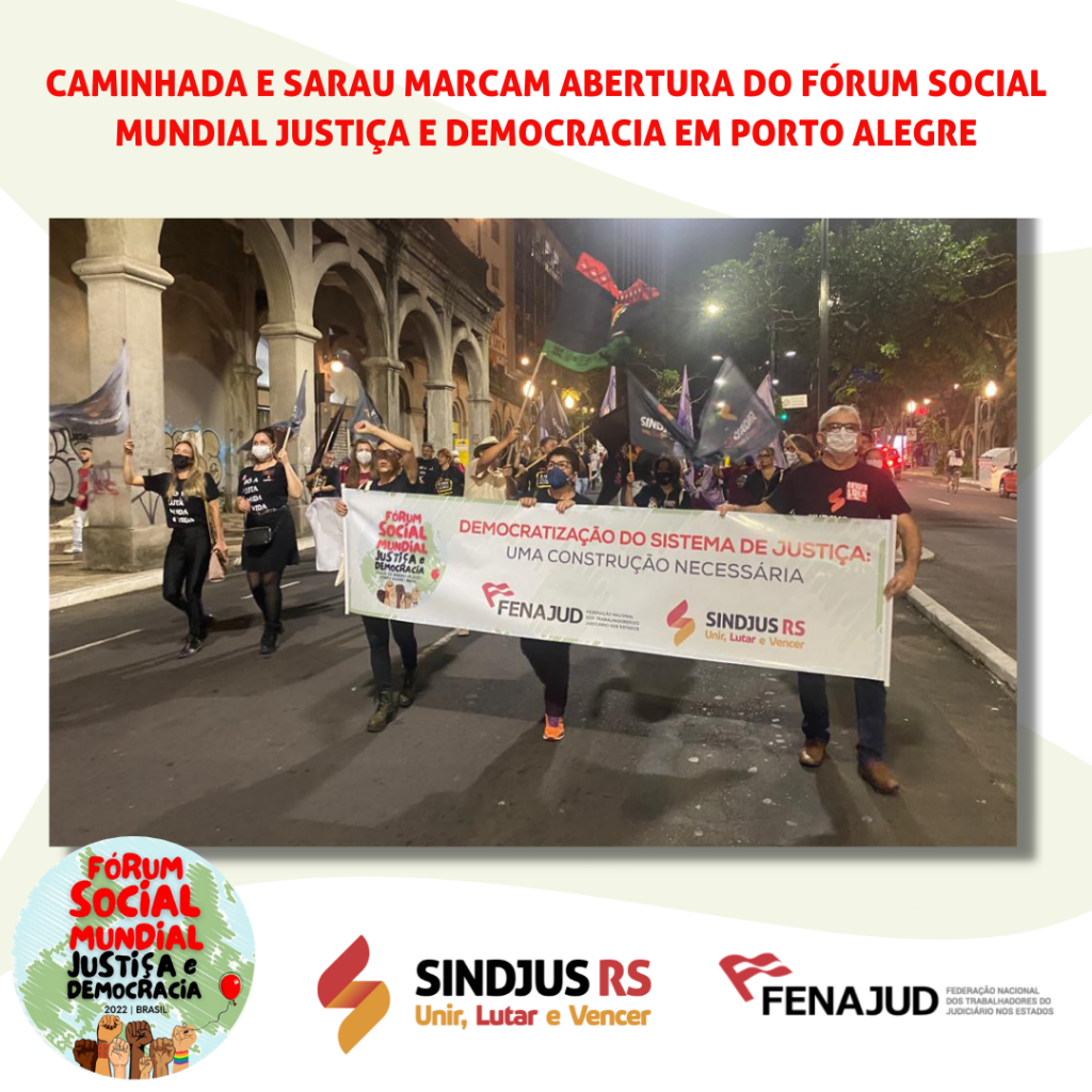 “Estamos aqui unidos para a construção de um outro mundo possível, que tenha como base um sistema de Justiça democrático, justo e igualitário”, apontou o diretor de Comunicação do Sindjus, Emanuel Dall’Bello, que também é o coordenador da Regional Sul da Fenajud. O Sindjus/RS é uma das entidades organizadoras do Fórum Social Mundial Justiça e Democracia (FSMJD)