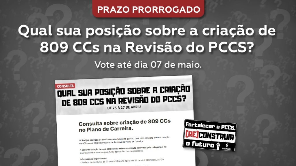 Prazo prorrogado: O Sindjus prorrogou até o dia 7 de maio a consulta com a categoria sobre a criação de 809 NOVOS CCs — incluídos pelo Tribunal de Justiça (TJRS), após o encerramento das negociações de Revisão do Plano de Carreira dos servidores concursados e efetivos.