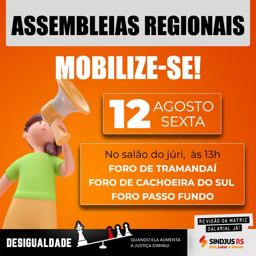 As assembleias regionais integram a pauta de lutas aprovada em Assembleia Geral Extraordinária, realizada em 29 de julho, e que aprovou a revisão de 32% na matriz salarial, a criação imediata de mesa de negociação com o TJRS e reajuste das verbas indenizatórias.