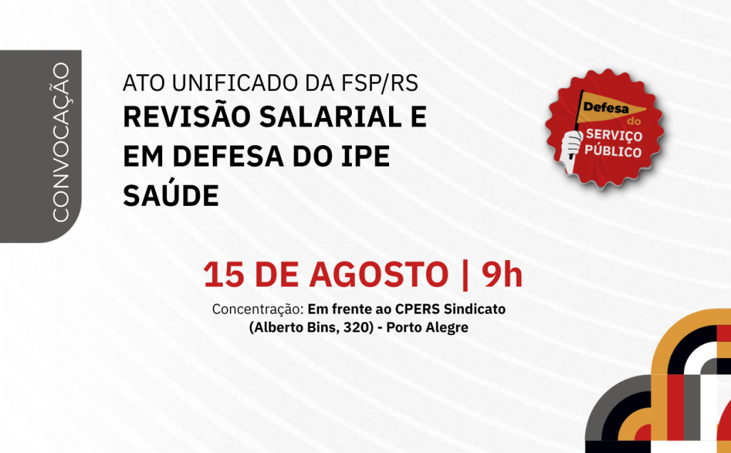 O Coordenador-Geral e a Diretoria Executiva do Sindicato dos Servidores da Justiça do Estado do Rio Grande do Sul (Sindjus/RS), em cumprimento às disposições estatutárias, CONVOCAM toda a categoria para o Ato pela Revisão Geral Anual e em Defesa do IPE Saúde no dia 15 de agosto de 2025 (sexta-feira), às 9h, em frente ao prédio CPERS Sindicato (Av. Alberto Bins, 480), em Porto Alegre, organizado pela Frente dos Servidores Públicos Estaduais, entidade que o Sindicato faz parte.