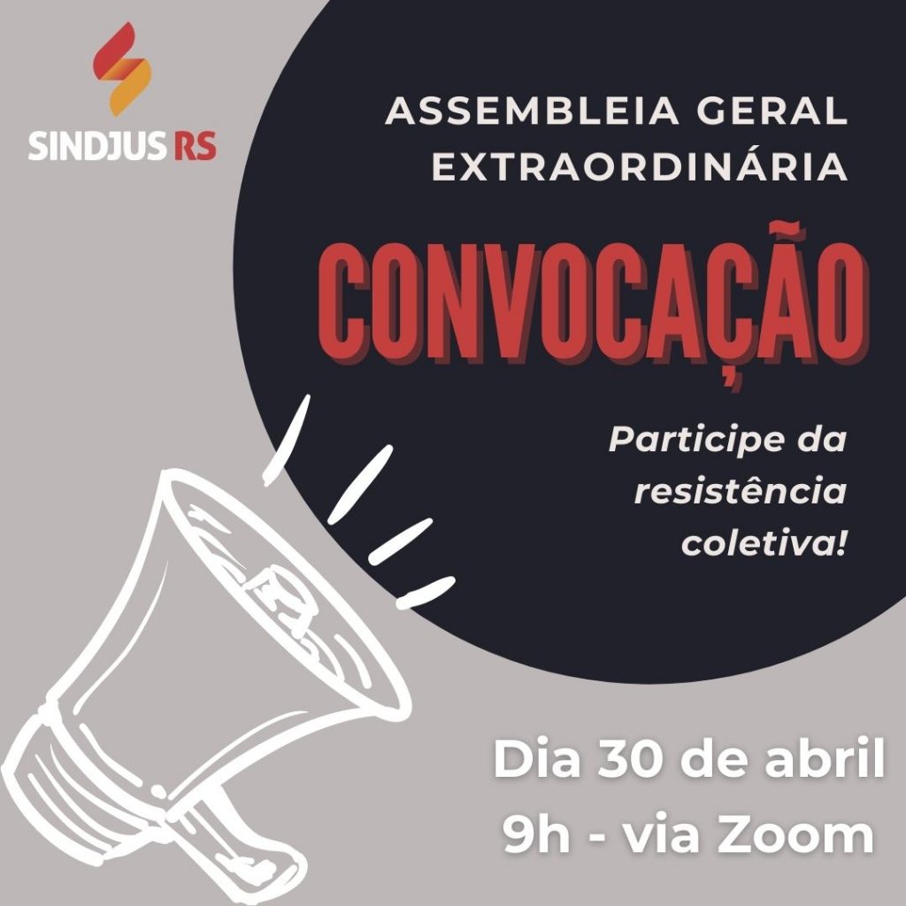 A Diretoria Executiva do Sindicato dos Servidores da Justiça do RS (Sindjus/RS), de acordo com o Artigo 65 do seu Estatuto Social, CONVOCA toda a categoria para ASSEMBLEIA GERAL EXTRAORDINÁRIA, que será realizada no dia 30 de abril de 2021, a partir das 9 horas, em primeira chamada, e 9h10 em segunda chamada, com a seguinte pauta:
