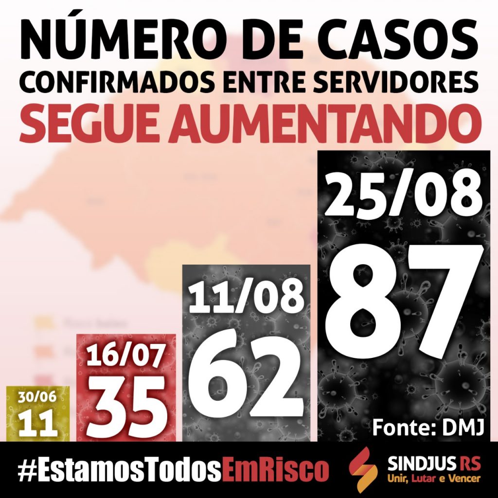 Longe de estar controlada, a pandemia do coronavírus segue levando milhares de  vidas todos os dias no país. Já são mais de 115 mil mortos no Brasil inteiro e mais de 3 mil no Rio Grande do Sul. O aumento expressivo de casos confirmados no Judiciário gaúcho após a retomada de atividades presenciais preocupa e reforça a necessidade de manter  todos os cuidados para prevenir o contágio.