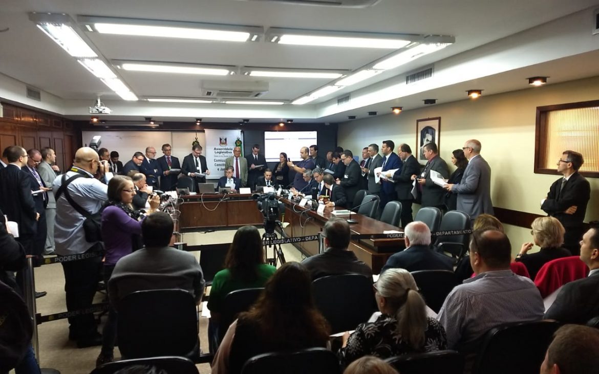 Os deputados da base governista se ausentaram minutos antes da apreciação do PL 218/2017( que trata da reposição salarial de 5,58% dos servidores do judiciário), o que tornou o número de parlamentares insuficiente para a votação na sessão da Comissão de Constituição e Justiça desta terça-feira, 28, na Sala Dr. Maurício Cardoso da ALRS. A manobra frustrou as expectativas dos representantes do SINDJUSRS e demais categorias que acompanhavam a sessão. Por outro lado, o PL 93/2017, que estava na ordem do dia, não teve preferência para apreciação, deixando os Oficiais Escreventes e de Arquivo mais aliviados. O presidente da CCJ, deputado Edson Brum (MDB), lamentou que seus colegas tivessem pedido verificação de quórum para dar continuidade a sessão, quando existiam 10 parlamentares na sala. No entanto, usando de prerrogativa, o deputado Frederico Antunes (PP), solicitou a verificação e apenas quatro deputados confirmaram presença. “Eu considero isso como se o deputado fosse um fantasma, mas respeito a decisão que faz parte do regimento da casa”, afirmou o parlamentar.