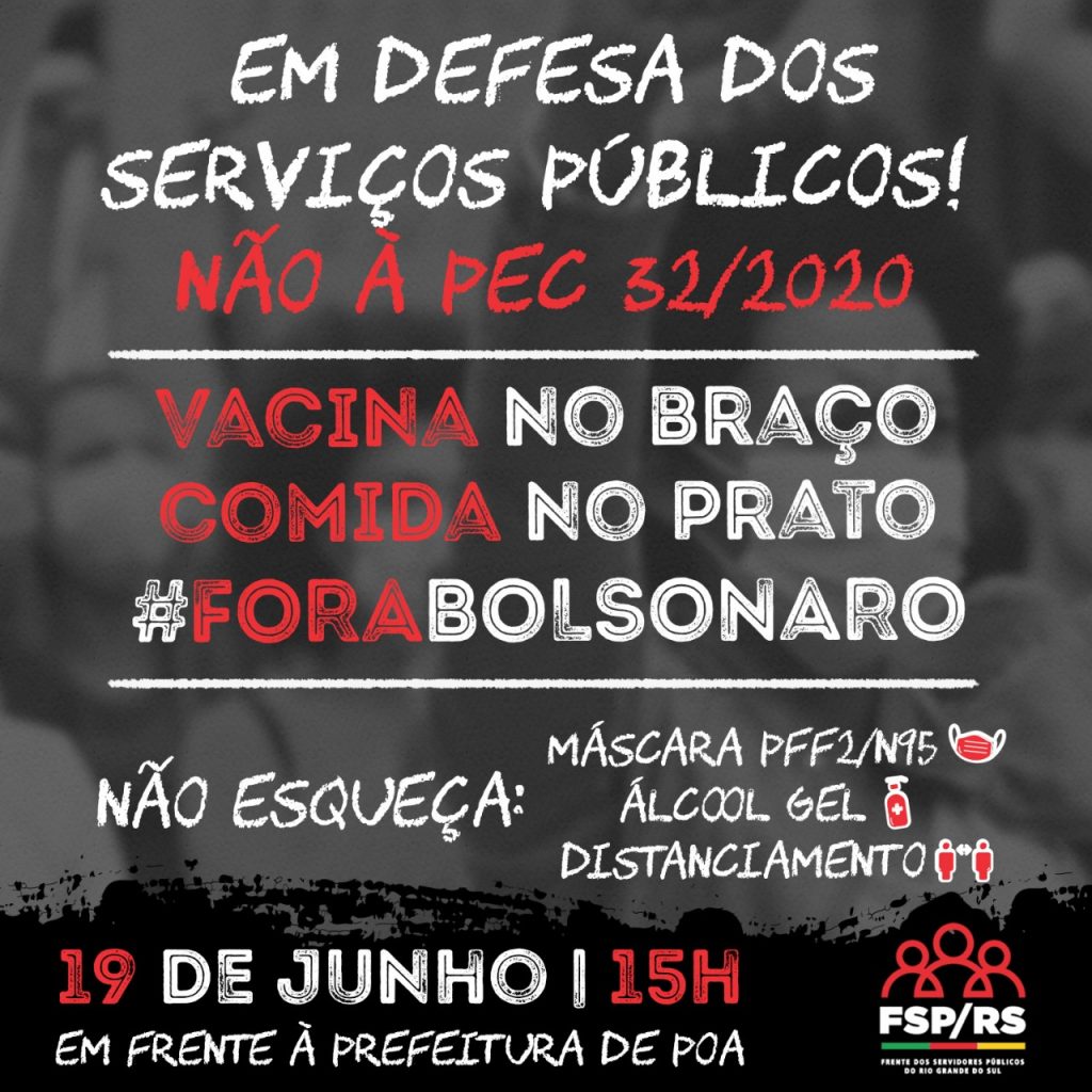 Em Porto Alegre, a concentração será às 15h, em frente a Prefeitura da Capital. Vamos unir as nossas vozes, dizer fora Bolsonaro, basta ao descaso com a vida do povo brasileiro; defender um auxílio emergencial digno de R$ 600 e dizer não à Reforma Administrativa e destruição dos serviços públicos.