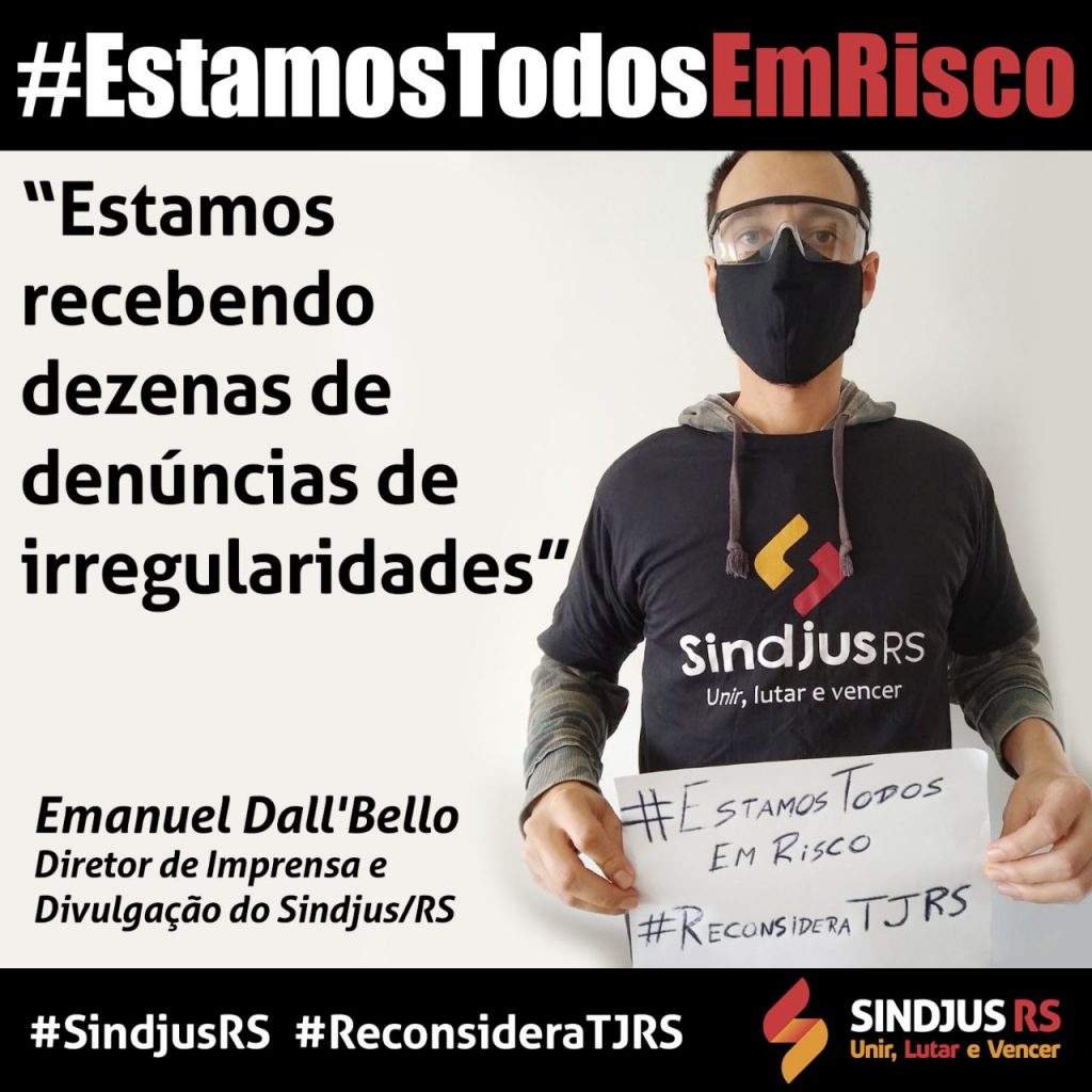 Além de atos e veiculação de peças com as mensagens da campanha, os dirigentes do sindicato esclarecem que é fundamental que os servidores em suas comarcas participem da mobilização para pressionar o Tribunal a reconsiderar a decisão. Para fortalecer o engajamento na campanha, os servidores podem enviar fotos das atividades em suas comarcas para o email imprensa@sindjus.com.br e postar em suas redes usando as hashtags #EstamosTodosEmRisco e #ReconsideraTJRS, o que pode ser feito como o exemplo do registro do diretor Emanuel Dall’Bello.