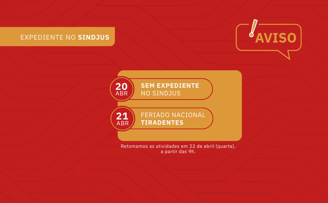 A direção do Sindjus/RS informa que no dia 20 de abril (segunda-feira) não teremos expediente, em razão do feriado nacional de Tiradentes, no dia 21 de abril (terça-feira). Retomamos as atividades normalmente no dia 22 de novembro (quarta-feira).