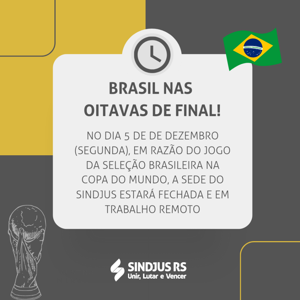 A direção do Sindjus/RS informa que no dia 5 de dezembro (segunda-feira) em razão do jogo da Seleção Brasileira nas oitavas de final da Copa do Mundo, a sede do Sindicato estará fechada, somente com atendimento remoto e por telefone.