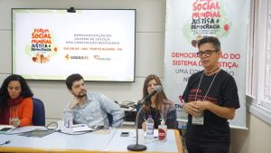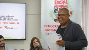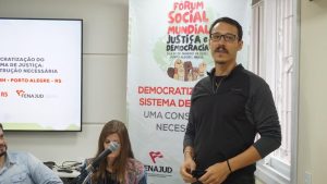 Ednaldo Martins, que é Coordenador de Política Sindical e Relações Internacionais da Fenajud, abriu sua explanação destacando o papel do Fórum Social Mundial Justiça e Democracia como uma oportunidade de não apenas debater, mas de construção de princípios para efetivar uma nova realidade, de aprimoramento do sistema de justiça e da própria democracia. “Esse Fórum entra num momento difícil da conjuntura nacional e provoca a sociedade brasileira a fazer um debate sobre o sistema de justiça como nunca se fez”, pontuou.