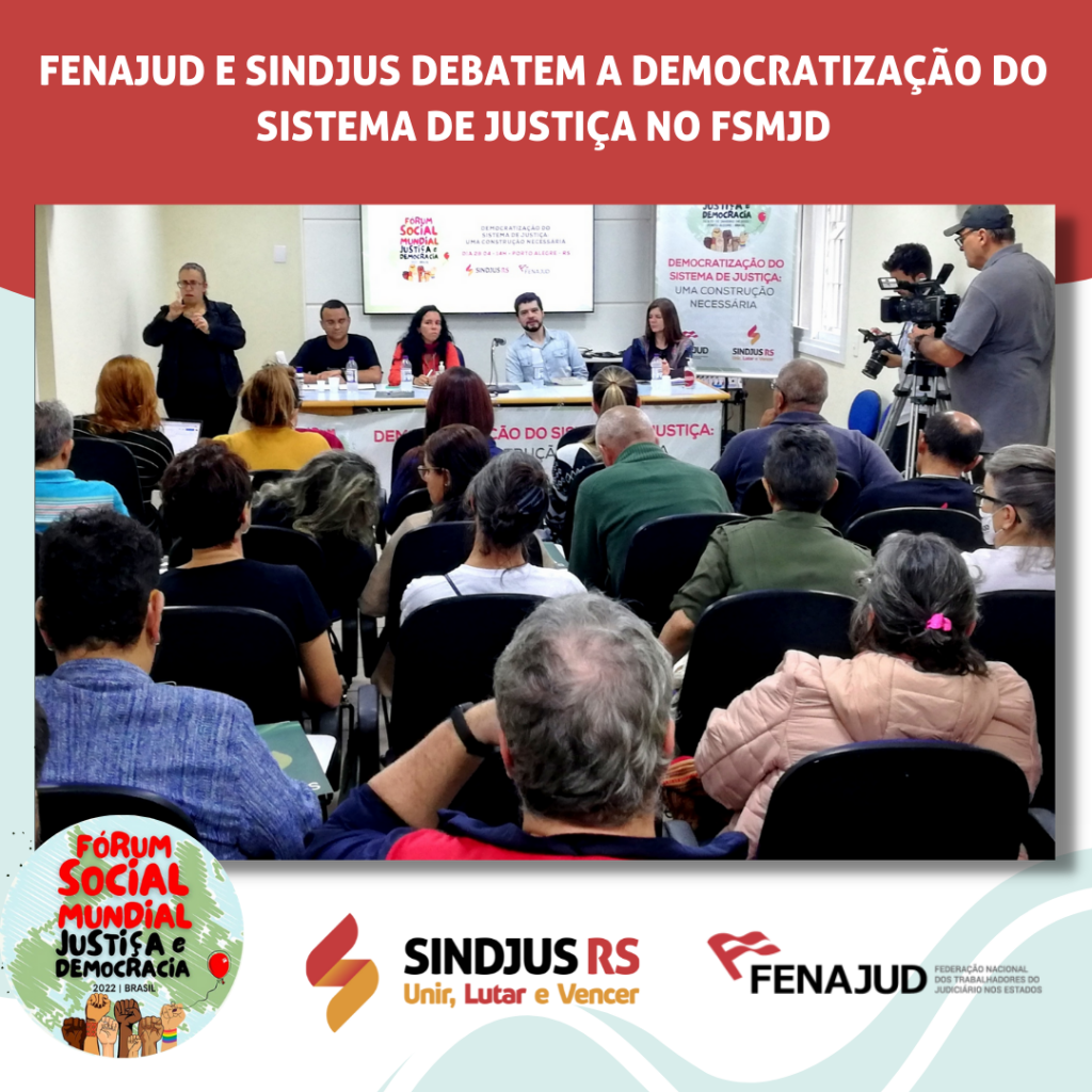 Dezenas de pessoas participaram na tarde desta quinta-feira (28) da mesa “Democratização do Sistema de Justiça, uma construção necessária”, promovida pela Fenajud com apoio do Sindjus/RS. A atividade integra a programação do Fórum Social Mundial Justiça e Democracia (FSMJD), que acontece até o dia 30 de abril, em Porto Alegre.
