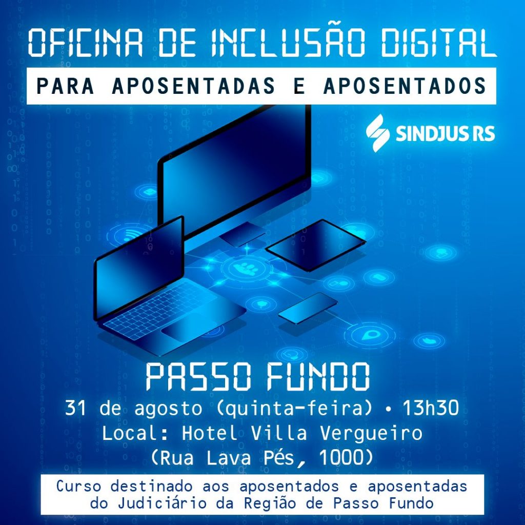O Sindjus/RS promoverá no dia 31 de agosto (quinta-feira) a segunda Oficina de Inclusão Digital, desta vez a atividade será em Passo Fundo. Voltada para servidoras e servidores da Justiça aposentados e residentes na comarca de Passo Fundo e região (veja abaixo as cidades), é gratuita e será realizada no Hotel Villa Vergueiro (Rua Lava Pés, 1000) a partir das 13h30.
