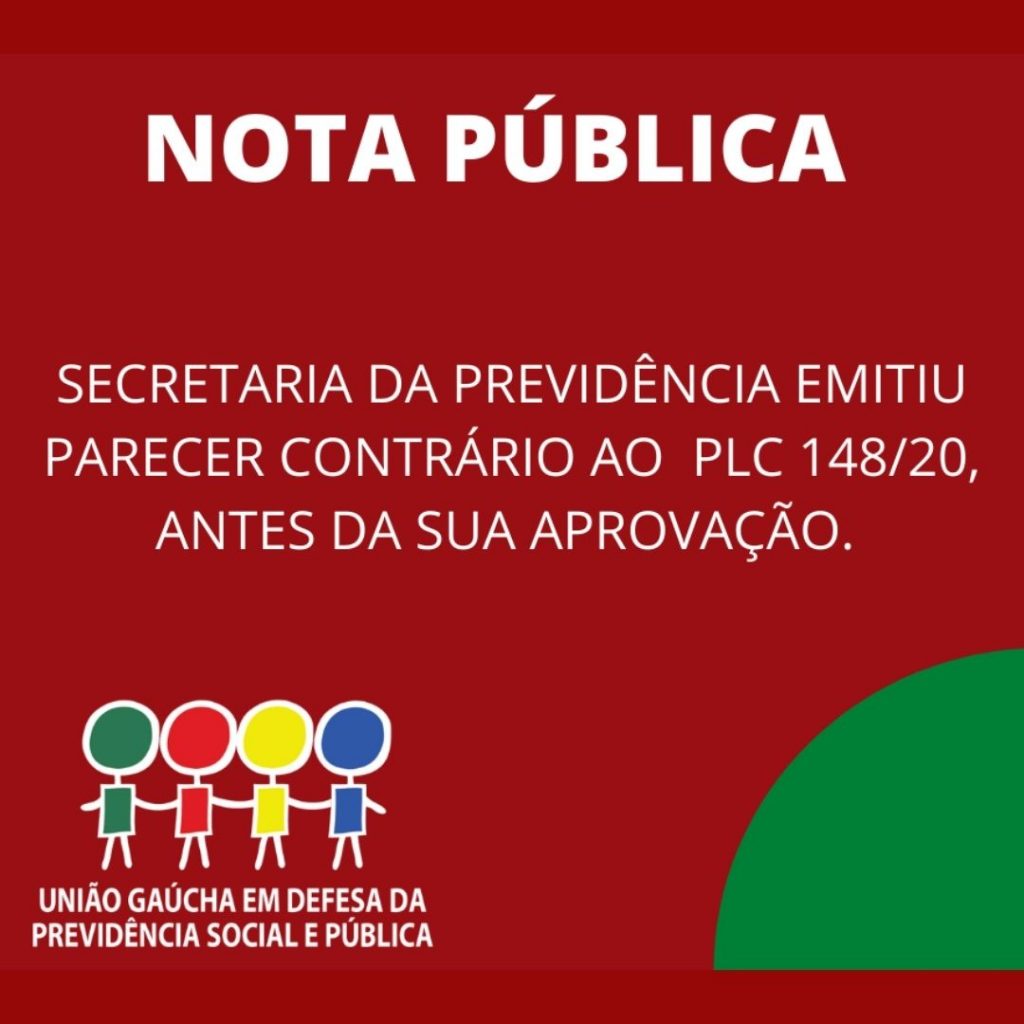 União Gaúcha em Defesa da Previdência Social e Pública vem a público informar a todos os cidadãos gaúchos, em especial, à imprensa e aos servidores públicos do Estado, que o Projeto de Lei Complementar 148/20 e seus respectivos estudos atuariais e financeiros, após ser submetido a análise da Secretaria de Previdência do Estado – SPREV, recebeu o parecer contrário à reestruturação do Fundoprev e à aprovação da lei, dentro do modelo apresentado.