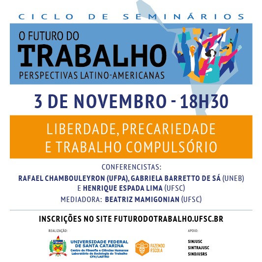 A programação completa com os demais seminários do Ciclo Internacional “O Futuro do Trabalho” está disponível em: futurodotrabalho.ufsc.br