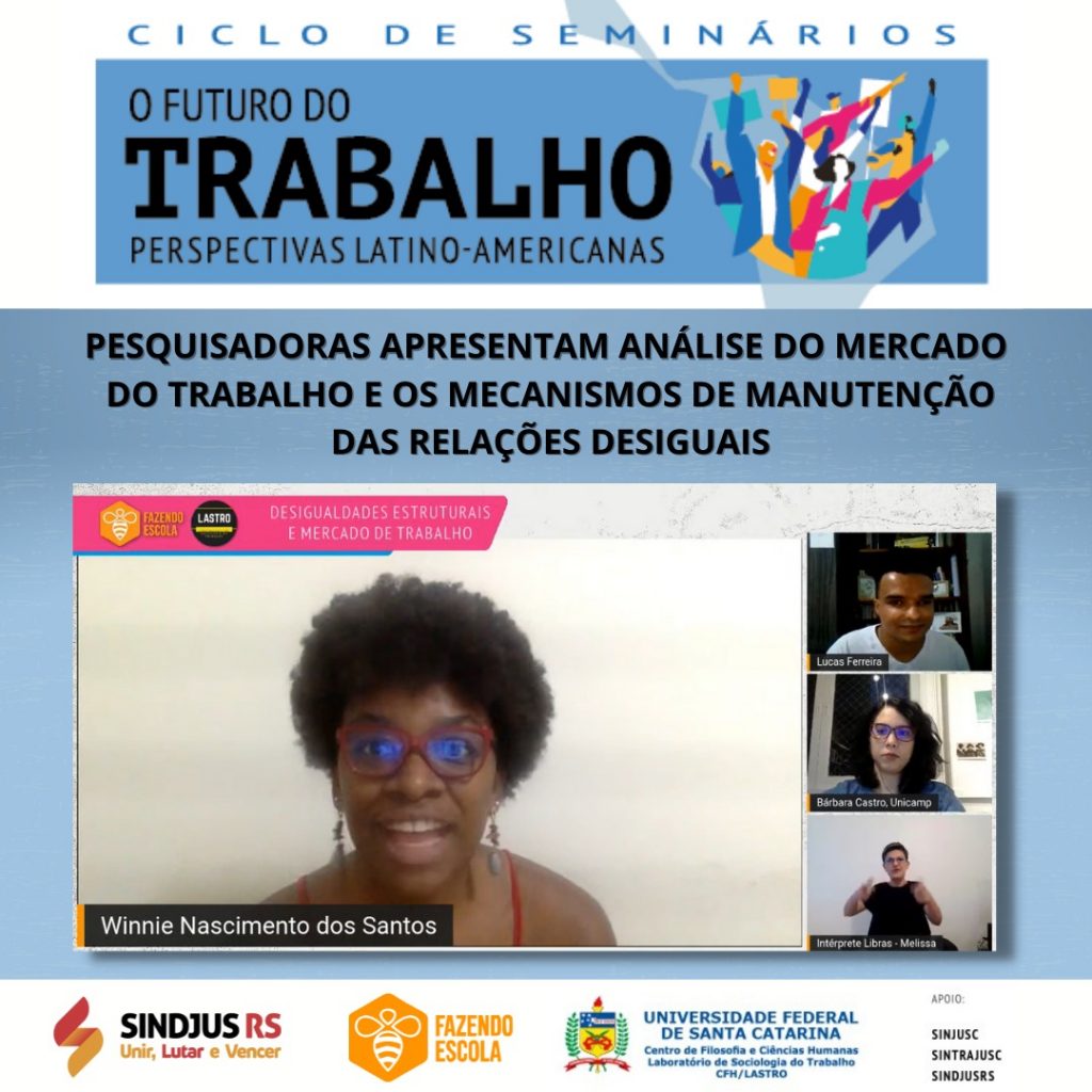 O seminário “Desigualdades estruturais e mercado de trabalho” realizado nesta quarta-feira (10), teve como enfoque a realidade contemporânea do mundo do trabalho e as profundas disparidades ainda presentes nas relações pautadas por questões de gênero e raça. A primeira palestrante, Winnie Santos, trouxe a apresentação “Gênero, sexualidade e e sociedade contemporânea: divisão racial e sexual do trabalho”, na qual traçou um amplo panorama sobre o objeto de suas pesquisas na área. Para a pesquisadora, as desigualdades estruturam o mercado de trabalho.