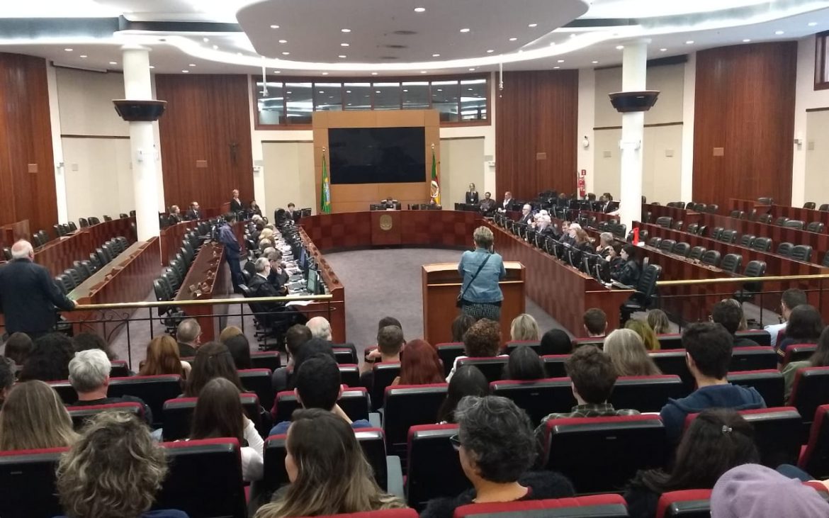 Dezenas de servidoras e servidores estiveram na tarde desta segunda-feira (11) no Tribunal de Justiça do Estado para acompanhar a sessão do Órgão Especial. A categoria está em greve há 49 dias. Na abertura da sessão, o presidente do TJRS, desembargador Carlos Eduardo Zietlow Duro, fez um longo discurso sobre a greve dos trabalhadores do Judiciário, declarando novamente que sempre esteve aberto ao diálogo e citando as oportunidades em que encontrou-se com representantes sindicais.