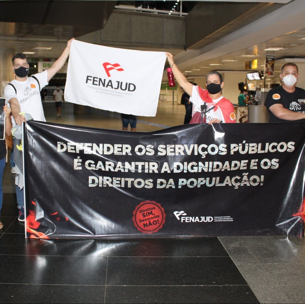 Nesta segunda e terça, 20 e 21 de setembro, servidores municipais, estaduais e federais promoveram uma grande mobilização objetivando derrotar a PEC 32/2020 na Câmara dos Deputados. A atividade contou com a participação da Fenajud (Federação Nacional dos Trabalhadores do Judiciário nos Estados), que esteve representada pelos coordenadores: Ana Carolina Lobo, Carolina Costa e Eduardo Couto. Delegações de sindicatos de base, como Serjusmig, Sintaj-BA, Sinjusc, Sindjud-PE, Sindjustiça-CE, Sinjus-MG e Serjal também se fizeram presentes.