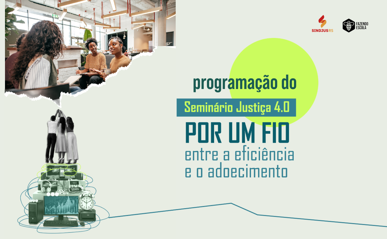 Está no ar a programação completa do Seminário “Justiça 4.0: por um fio entre a eficiência e o adoecimento”, promovido pelo Sindjus e pelo Fazendo Escola, que acontece no dia 27 de março (sexta-feira), na Fábrica do Futuro (Rua Câncio Gomes, 609), em Porto Alegre.