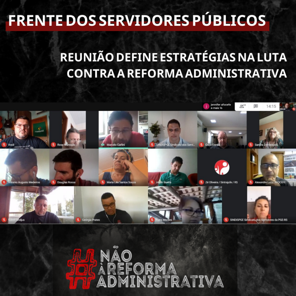 A Frente dos Servidores Públicos do RS (FSP/RS), em reunião realizada nesta sexta-feira (12/2), debateu a Reforma Administrativa (PEC 32/2020) e o Projeto Mais Brasil, que estão tramitando no Congresso Federal e ameaçam a prestação dos serviços públicos para a população.
