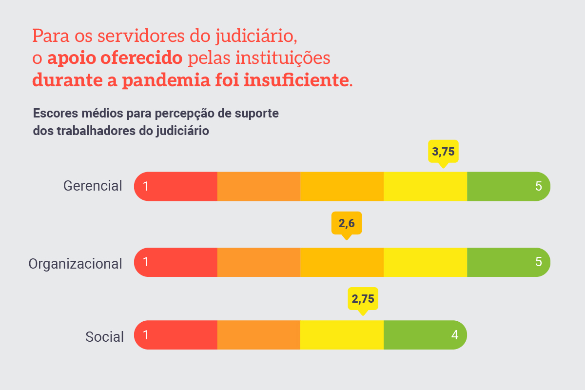 Através do questionário, a equipe do NEPPOT usou instrumentos para medir a percepção dos servidores do judiciário em relação aos diferentes tipos de suporte necessários para o trabalho durante a pandemia. O suporte social se refere às redes de apoio e confiança entre as equipes, bem como a circulação de informação e o sentimento de solidariedade entre trabalhadores. Já o gerencial se refere ao apoio prestado pela chefia imediata. Enquanto o organizacional diz respeito a questões como sobrecarga de trabalho, estabelecimento de metas adequadas, reconhecimentos dos saberes de trabalhadores e apoio material.