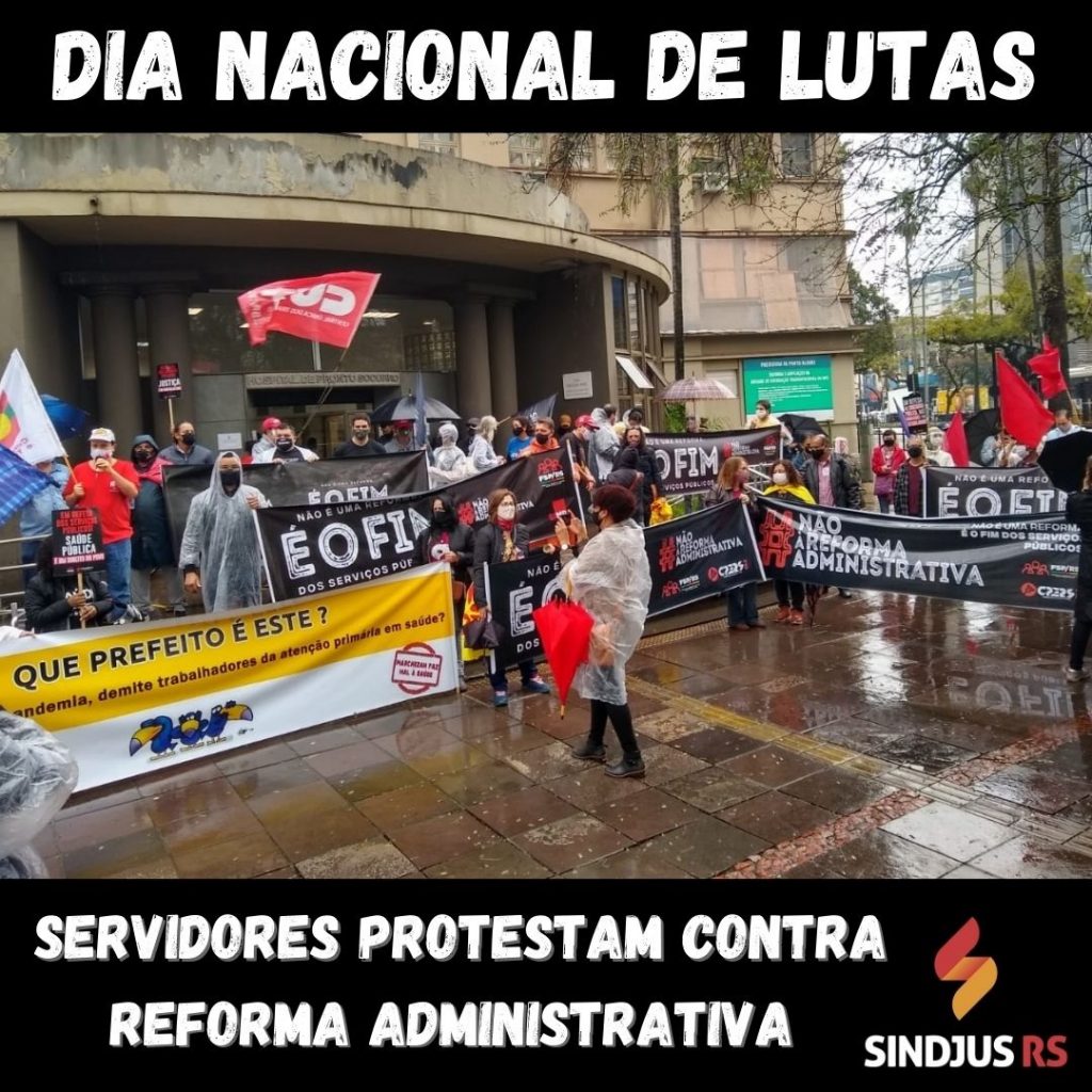 Dirigentes do Sindjus estiveram no ato promovido na parte da manhã em Porto Alegre, com representantes de dezenas de entidades dos trabalhadores públicos. O objetivo da ação foi “sensibilizar a sociedade para o que significa a reforma administrativa na vida das pessoas”, conforme esclareceu a diretora do Sindjus, Janete Fabíola Togni.