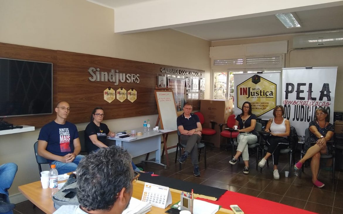 No sábado (29), diretores das entidades representativas dos servidores da Justiça estiveram na sede do Sindjus para avançar nas discussões e estudos sobre o Plano de carreira, cargos e salários (PCCS). Em conjunto com as assessorias técnicas, a direção do Sindjus está debruçada sobre os estudos e as centenas de sugestões enviadas pelos servidores para construir o plano de maneira democrática e abrangente. “Temos esse processo como prioridade máxima e estamos buscando construir de forma integrada, com ampla participação da categoria, um plano que atenda a todos de maneira justa”, destacou o diretor jurídico, Valdir Bueira.