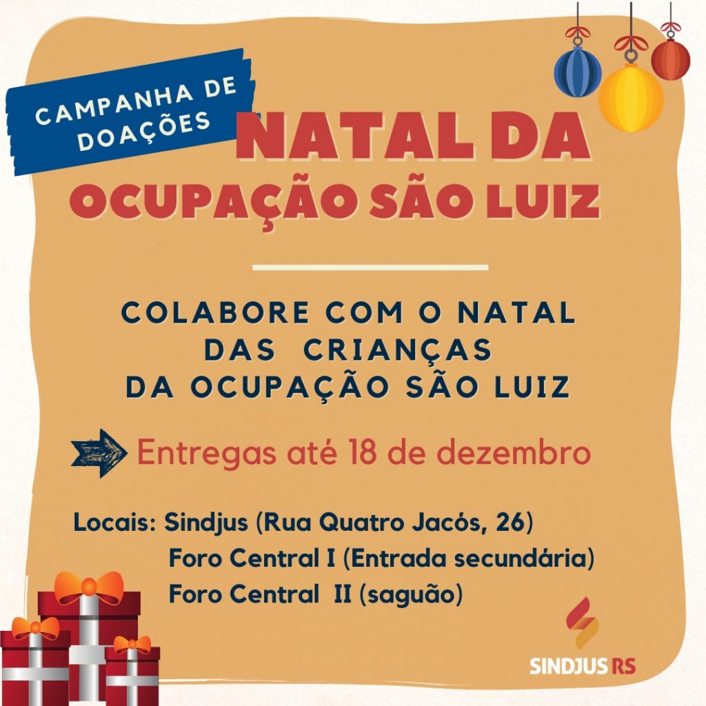 Contamos com o teu apoio! As doações podem ser deixadas até o dia 18 de dezembro na sede do Sindjus/RS e também nos prédios I e II do Foro Central.