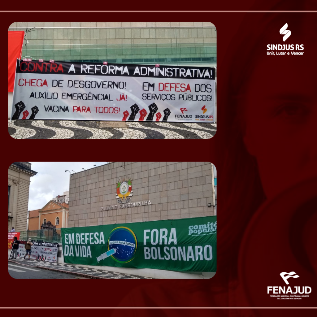O Sindjus marcou presença nas atividades realizadas nesta quarta-feira (24/3), em Porto Alegre, e que marcaram o Dia Nacional de Luta em Defesa dos Serviços Públicos. Para garantir a segurança e seguir os protocolos sanitários, em razão do gravíssimo momento da pandemia no RS, os diretores do Sindicato colocaram faixas em frente ao Palácio Piratini e à Assembleia Legislativa.