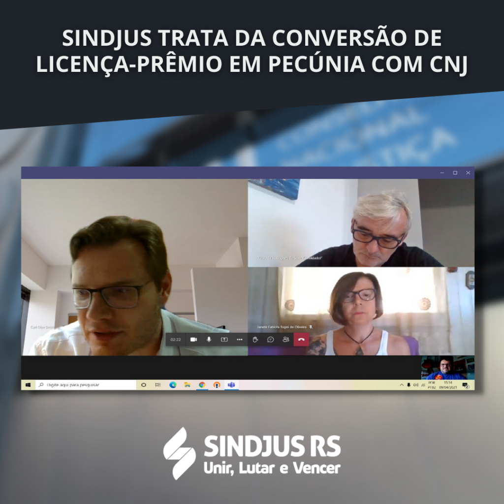 A direção do Sindjus realizou, nesta sexta-feira (9/4), de reunião virtual com o Conselho Nacional de Justiça (CNJ) para tratar do expediente que prevê a conversão da licença-prêmio em pecúnia, pauta que é aguardada há muito tempo pelos trabalhadores e trabalhadoras da Justiça.
