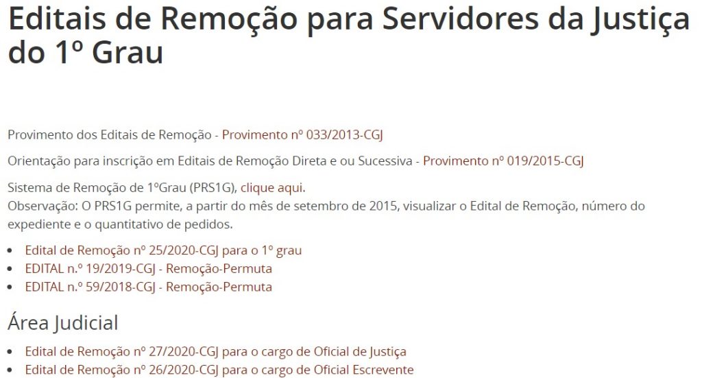 O edital nº 25, para remoção por permuta no 1º grau, tem prazo para inscrições até o dia 30 de junho. Os editais 26 e 27 tratam de remoção direta para os cargos de oficial escrevente e oficial de Justiça, respectivamente, e o prazo para inscrição de ambos encerra-se nesta sexta-feira, 5 de junho. (Acesse pelos links abaixo)