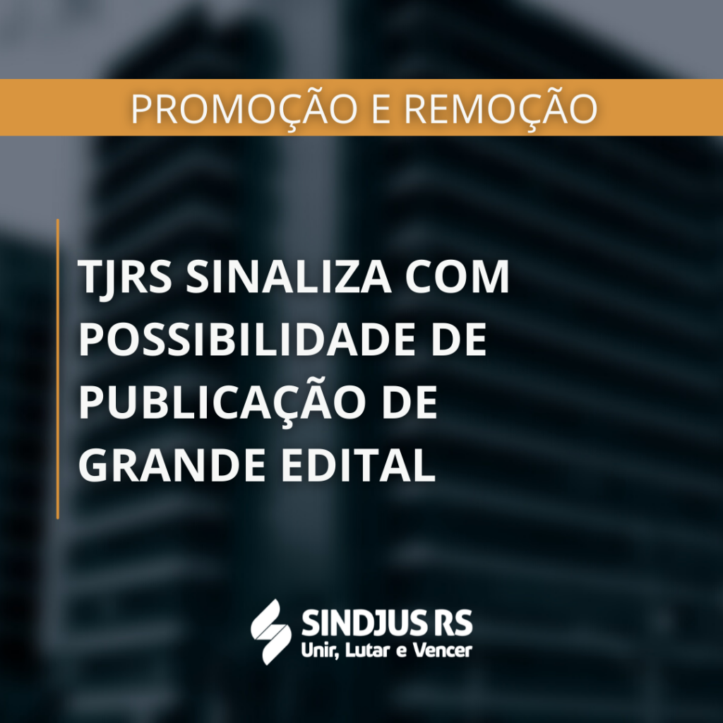 Em relação ao pleito feito pelo Sindjus/RS ao Tribunal de Justiça do RS (TJRS) sobre a necessidade de editais de promoção e remoção para todos os cargos, a Corregedoria-Geral da Justiça (CGJ) informou que já há um estudo sendo feito, junto ao DIGEP, para que seja publicado um edital com o maior número de vagas possíveis.